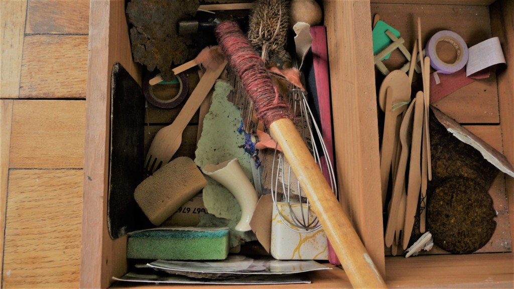 The Kitchen Drawer. Length 40 cm. Height 18 cm. Width 21 cm. A wooden box, which acquired its contents in exactly the same way as a kitchen drawer becomes a container for the detritus we forget we may need. A kind of diary of objects. 2020.