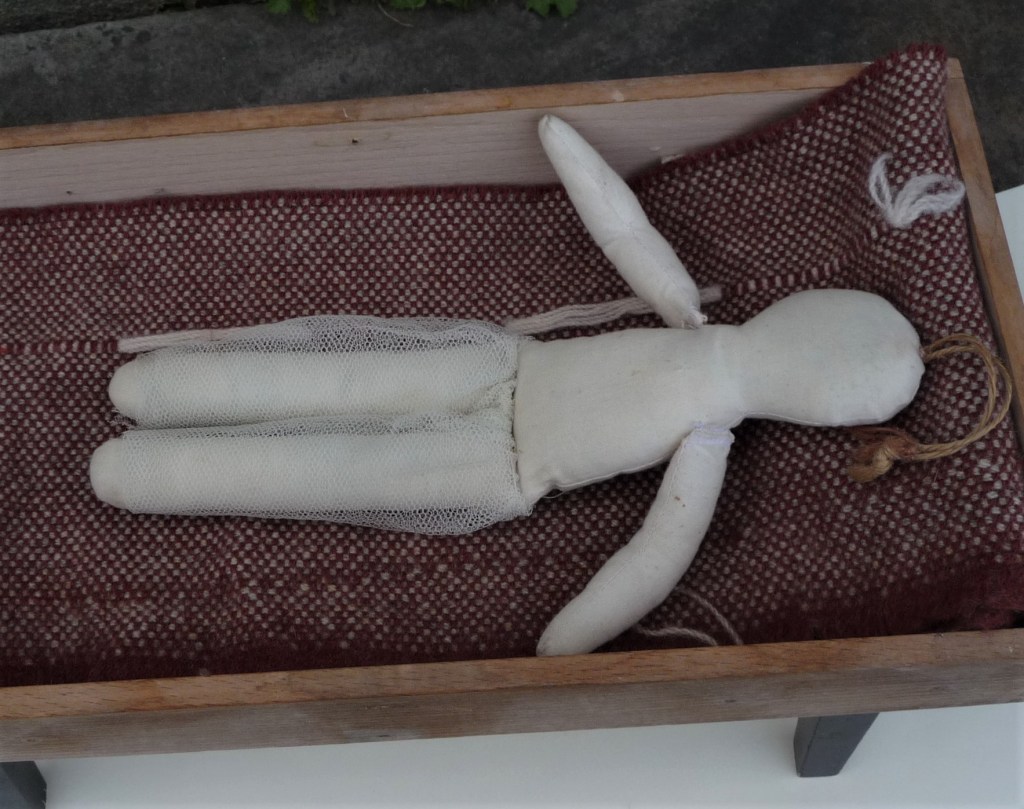 I make my bed and lie on it… Unfinished work. Interactive sculptural work. The cot dimensions are: H 21 cm, W 21 cm, H 31 cm. A small cloth doll lies in a cot. She represents an exposing sense of insecurity and unhoused-ness. A woman lying in an open space. The viewer will have a little stool to sit on and a book from which to read to her. The stories are based on years of dreams of searching through or trying to access a house.
