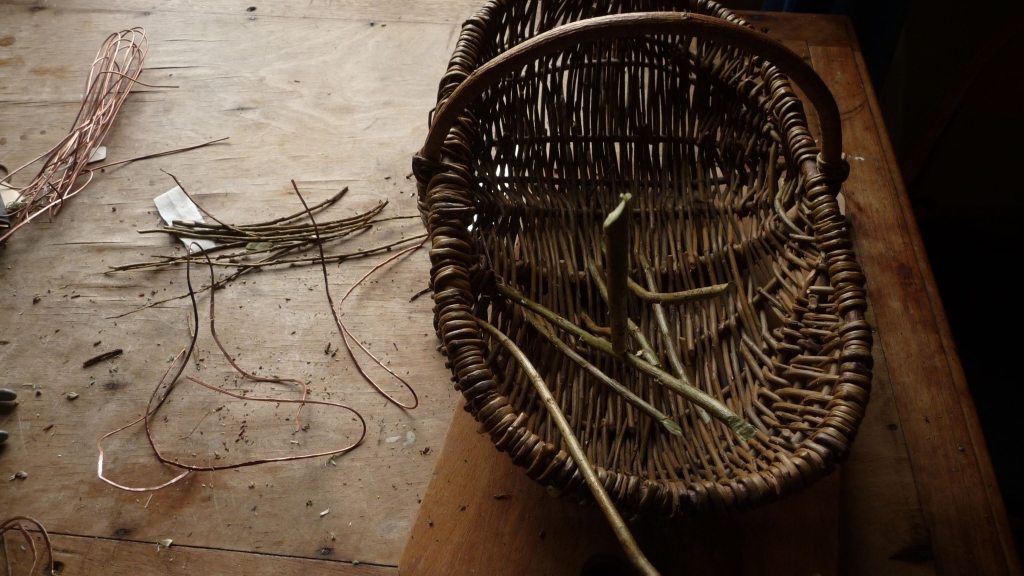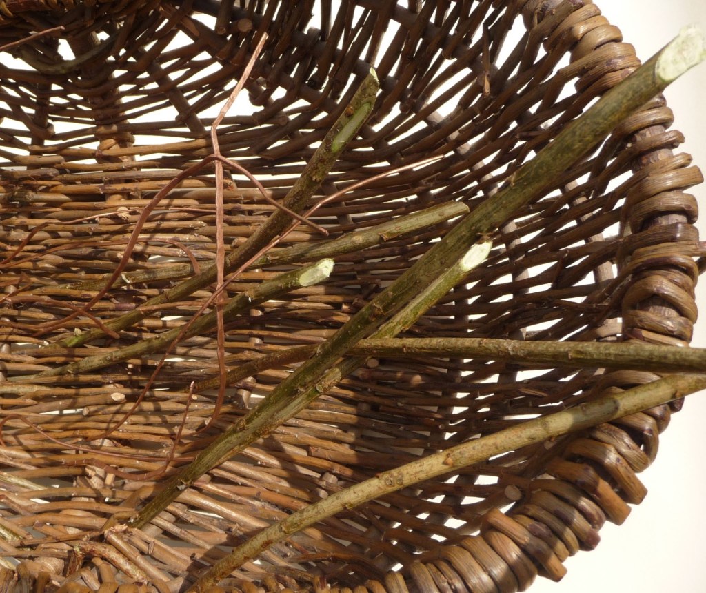 Cauldron of Story. Length 52 cm. Height 30 cm. Width 28 cm. A basket made years ago, which I reworked as a sculpture representing dangerous themes in fairy-tale. Woven with flattened copper wire and additional, sharpened pieces of willow. 2020.